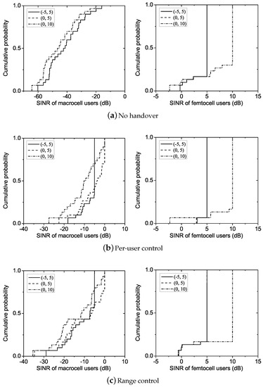 Probability distribution of users’ achieved SINRs under various numbers of macrocell and femtocell users when the per-user handover control is considered (the target SINR of macrocell users and that of femtocell users are dB and 5 dB, respectively).