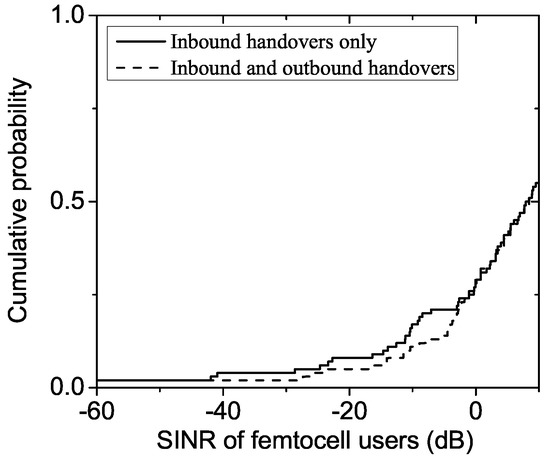 Probability distribution of femtocell users’ achieved SINRs when allowing inbound handovers only and when allowing both inbound and outbound handovers (M = 50, F = 100).