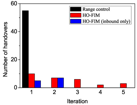 Finally, the number of handovers is shown for different schemes in Figure 11 (M = 30, F = 50). The range control triggers a large number of handovers at the first iteration, thus incurring significant handover overhead at once. Thanks to the finer control granularity, HO-FIM triggers a smaller number of handovers at each iteration, which even decreases over iterations. HO-FIM with inbound handovers triggers an even smaller number of handovers, but at the expense of reduced performance gain (as seen in Figure 10).