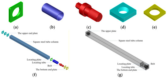 Diagram of the new connection structure. (a) Locating plate (b) locating tube (c) bolt (d) upper-end plate (e) bottom-end plate (f) assembly (g) assembly completed.