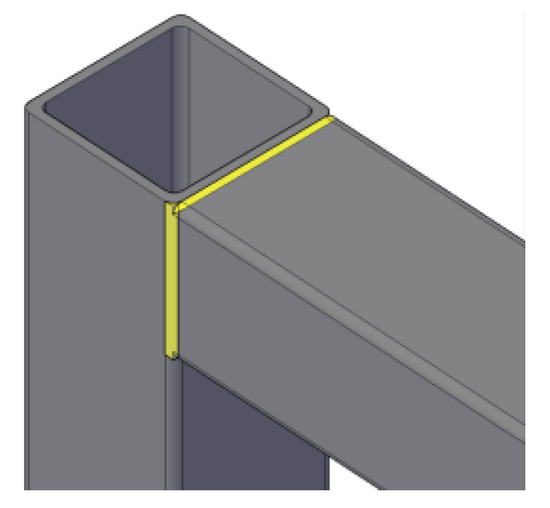 The connection is composed as follows. The locating plate and locating tube are successively welded into the square steel tube. The locating tube is the inscribed circle for the square steel tube. The giant bolt is placed into the locating tube, and the prefabricated end plates are welded to the upper and lower ends of the column. This process is completed in the factory. It is assembled as shown in Figure 2f, and the assembly is completed in the way shown in Figure 2g. To avoid the bolt tilting or even reversing, the upper part of the bolt will be made into a cylinder whose diameter is slightly less than that of the positioning cylinder. For the convenience of centering, a certain space is reserved in front of the screw thread. To ensure firm welding, the upper-end plate with the screw thread on the top of the column will be divided into three parts, which are welded one after another. The bottom-end plate with no screw thread at the bottom of the column is welded twice successively; groove welding is adopted. The other assembly processes of the modules in the factory stay unchanged. The beams and the columns are welded together, and V grooves are made on the four beam edges to strengthen the welding, as shown in Figure 3, and the yellow part of the figure shows the weld seam.