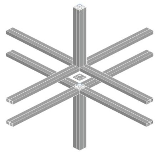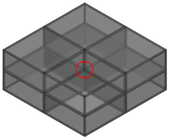 The modular joint is the key to, and the main difficulty of, modular buildings. Nowadays, various connection types rather than a particular one are employed in the construction industry—mainly due to the fact that current connection types have difficulties in meeting all the design and construction requirements of the modular buildings [28]. The difficulties are mainly as follows. Firstly, for the central joint, it is necessary to connect the eight modules as a whole on the construction site. Secondly, welding should be avoided as far as possible in the site operation. Thirdly, as the assembly of the modules comes after their fabrication, it is usually difficult to find the working face of the construction, especially the assembly of the last module, as shown in Figure 1. Fourthly, damage to the modules during field assembly needs to be avoided to spare the need for secondary decoration. Finally, the weakening of the original force performance of the beams and columns should also be avoided. Thus, the design of innovative connections becomes necessary for overcoming the challenges in the design and construction of modular buildings.