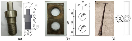 Object picture and dimension drawing of components. (a) Special bolt (b) base plate (c) twisting tool (d) upper-end plate (e) bottom-end plate (f) diagonal stiffener of S1 and S2.