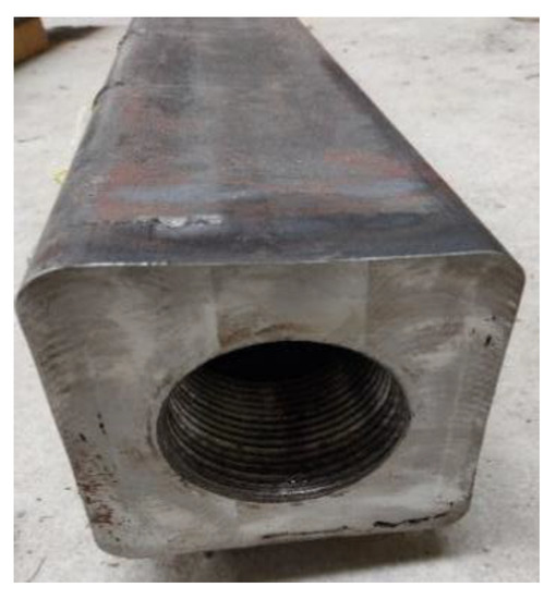 To avoid possible damage to the welding line between the end plate and the column, the number of welding lines was increased, with three upper-end plates and two bottom-end plates. No gaps were designed between the end plates; otherwise, the bolt would not be screwed on. After that, the welding was polished. Figure 9 shows the upper-end plate, which was welded three times successively. E43 welding rods were adopted for all of the welding.