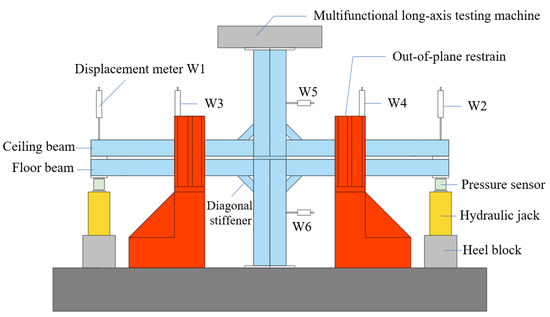 This test was carried out in the Jiangsu Key Laboratory of Environmental Impact and Structural Safety in Engineering. The specimen and test loading device are shown in Figure 10. To simulate the actual condition of the connection under the action of vertical gravity load, the loading specimen was placed upside-down before loading, and then the constant axial force value was preset for the top of the column by a multifunctional long-axis testing machine. A hydraulic jack was used to add symmetrical force on both ends of the beam in a vertical direction. Before loading, the pressure plate of the long-axis testing machine and the column-top force transferring plate were centered geometrically and held closely together to ensure that both the column ends did not slide in the opposite horizontal direction, and that the loading of both ends proceeded synchronously. There were two security bolts at the bottom end of the column, which were not intended to keep the components in place but to prevent their accidental collapse. Preloading before the formal test was carried out to ensure that all parts of the joints were in full contact with each other. At the same time, the field test system and the loading system were adjusted. Before the formal loading, a constant axial force was applied on the square steel tube column with a nominal ratio of axial compression stress of 0.25. The axial load N at the end of the column is calculated as follows: