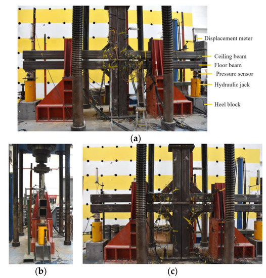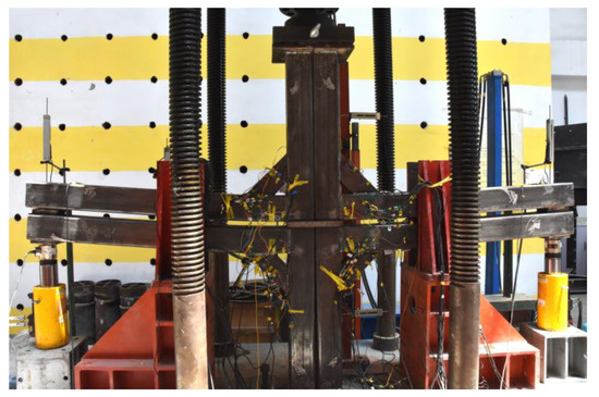 For the sake of safety, the axial force was maintained at the rate of 20 kN/min to achieve 534 kN. After the axial force achieved the predetermined value, synchronous monotonous vertical loads were applied at both ends of the beam. When loading began at the end of the beam, the loading value was increased by 10 kN per level. When the nonlinear evolution of the load–displacement curve occurred, the loading value was reduced to 5 kN per level. The test site is shown in Figure 11.