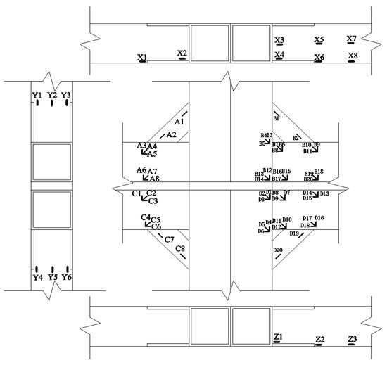 The strain of the control points was collected by a DH3816N static strain tester. The strain gages were laid out as shown in Figure 12. The strain gauges of the front joint were laid out in areas A, B, C and D. Area X shows the strain gauge arrangement from a vertical view; that is, the layout of the strain gauge on the upper part of the upper beam. Area Y shows the arrangement of strain gauges at the left end of the column. Area Z shows the layout of the strain gauges on the lower part of the bottom beam.