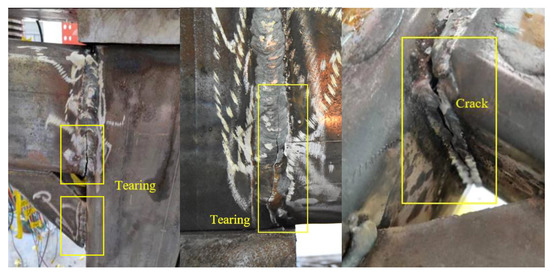 It was concluded from the experimental phenomena that two kinds of damage occurred—namely weld failure and beam buckling. The former happened when the diagonal stiffeners were small and the welding line was of poor quality. When the diagonal stiffeners were large, the failure mode was beam buckling. The damages happened to the beam or the beam–column joints in the module. The connection between modules remained undamaged, which can be seen from Figure 14 and the experimental phenomenon.