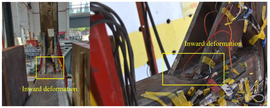When the vertical load on the beam end was less than 80 kN, no parts of specimen S1 demonstrated significant phenomena, and the measured strain values did not reach the yield strain of the steel material. At the same time, the load–displacement curve showed an approximative linear relationship, which indicated that the specimen was in an elastic state. When the vertical load reached 80 kN and the curve radian increased, the loading was changed by 5 kN per level. When the loading at the end of the beam reached 100 kN, the strain value of measurement points B1, B2 and B9 had also reached the yield strain value of the steel (1.75 × 103), which showed that some parts of specimen S1 had reached the stage of plasticity. Specimen S2 could only reach the yield strain when the load reached approximately 110 kN. As the load on the beam end increased gradually to 105 kN, with a loud bang, a weld failure occurred at the join between the right beam and the column of specimen S1, and the load on the beam end fell back. Then, a weld failure also occurred at the join between the column and the diagonal stiffeners, as shown in Figure 13. As judged, the early breakdown occurred due to the poor quality of the welding line. The undamaged left end beam of S1 continued to be loaded, and a weld failure occurred when the load increased to 120 kN. As for to specimen S2, the diagonal stiffeners had been strengthened and the weld quality had also been inspected. Thus, loading could continue, and the beam warped up obviously, as shown in Figure 14. When the loading reached 150 KN, the left side of the beam end was buckling and its displacement increased suddenly. A large inward deformation occurred at the beam end near the joint domain, as shown in Figure 15, and the loading came to an end.