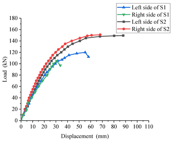 Figure 16 displays the load–displacement curve of the beam end. Due to the loading on the manual control pump and the fluctuations of the display on the monitor, asymmetry occurred when loading occurred from both ends. It can be seen from the diagram that the load–displacement curve of all specimens basically fits, which means that both ends are fundamentally symmetrical while loading.