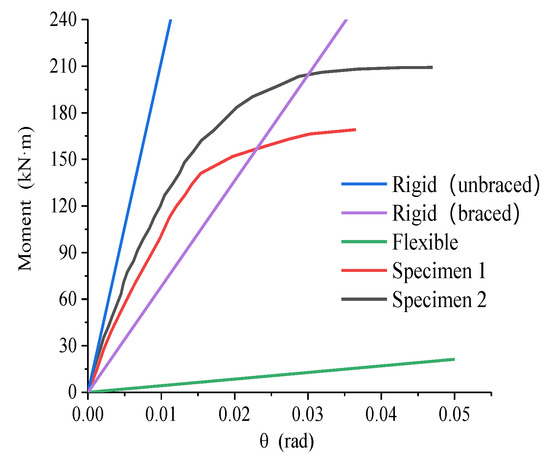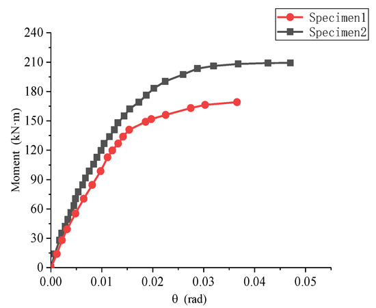The left sides of specimens S1 and S2 are chosen for analysis, and the bending moment–rotation curve is shown in Figure 17.
