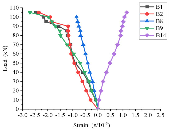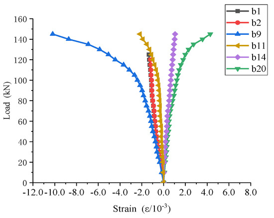 For specimen S2, the loading in area b is shown in Figure 22. The strain at b9 is the most obvious and has completely reached the plastic state. This indicates that the join between the stiffeners and beam experiences the greatest strain in the vertical direction, and buckling finally occurs near the join between the diagonal stiffeners and the beam, which corresponds with the failure mode. Point b20 has also reached the plastic state, indicating that the lower part of the beam bore a large pulling force in the horizontal direction. The laws of other points are similar to that of S1, and Figure 23 shows the load–strain curves of several typical points.