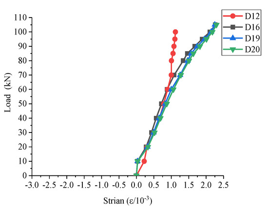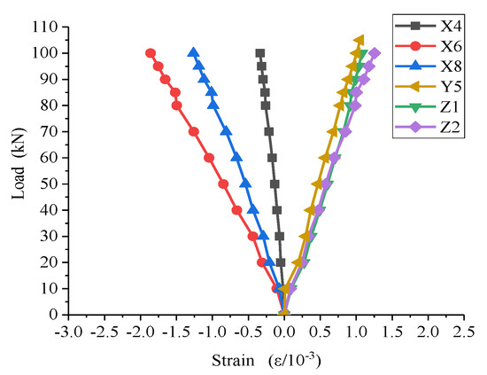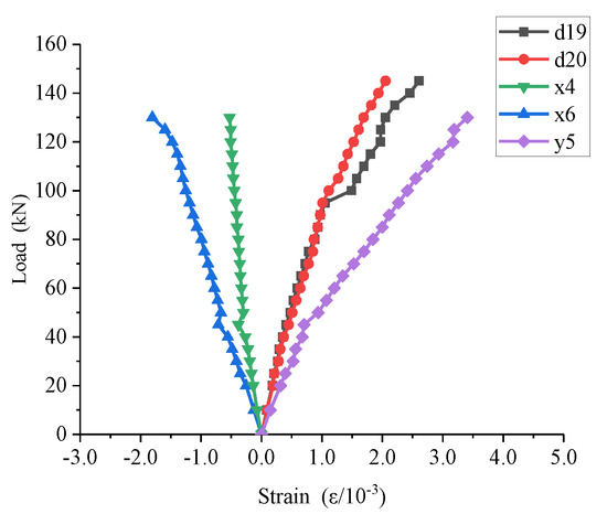 Points exhibiting large strain and points in the key parts for analysis are selected for analysis. The points of specimen S1 are marked with capital letters and those of specimen S2 with lowercase letters. For specimen S1, the load–strain curve of area B is shown in Figure 19, area D is shown in Figure 20, and areas X, Y and Z are shown in Figure 21.