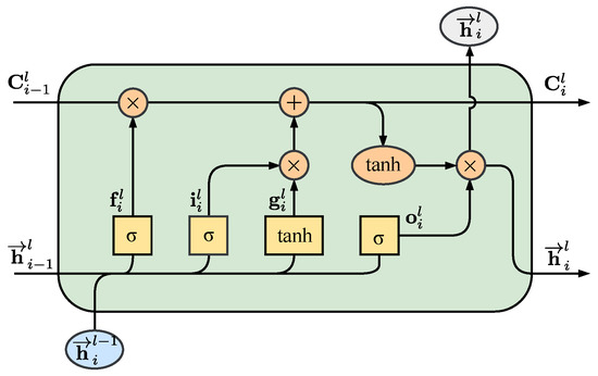 where , , , , , and are the input gate, forget gate, output gate, candidate gate, cell state, and hidden state, respectively, all of which are of the size of an -dimensional vector. In (6)–(9), the terms are the weight matrices between cells of layer –l, the terms are the weight matrices between consecutive cells of layer l, and the terms are the bias vector at each layer. The weight matrices and bias values in a cell are shared along the length of the sequence, thus reducing the total number of weights and hidden neurons in the network. The sigmoid function and hyperbolic tangent function are used as activation functions, and ⊙ denote element-wise multiplication.