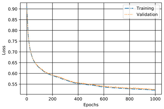 Figure 5 shows the convergence of the BDLSTM over each training epoch on the training and validation set with and a batch size . The loss of the model on both datasets decreased steadily after each epoch, and the gap was minimal, suggesting no overfitting during training.