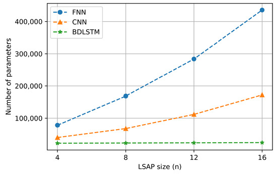 Figure 6 shows the complexity comparison of deep neural networks with a size n for the LSAP. Here, we focused on the number of trainable parameters to determine the complexity of the network, where the trainable parameters were the weight and bias values. The proposed BDLSTM was robust with respect to the complexity owing to the change in n compared to FNN and CNN. This was because the FNN model required n different fully-connected layers for n sub-assignment problems, and the sizes of the final layer and output layers of CNN scaled according to n. Because the weights in a layer of the BDLSTM were shared among all sub-assignment problems, the number of trainable parameters was stable to the change in n, resulting in low memory requirements. When , the BDLSTM achieved the best result while requiring 18- and seven-times fewer parameters than FNN and CNN, respectively.