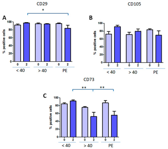Although the yield of hAMSCs from PE donors was lower than that for non-aged and aged women, also these donors gave sufficient numbers of hAMSCs to be expanded and cultured up to passage 5. If, however, we think that the advantage to comply on these ethical sources of MSCs is to yield a higher number of cells and avoid passaging that could lead to karyotypic abnormalities, this is a setback with pathological hAMSCs. Since the gestational age is similar between Group 1 and Group 2, and is even lower in Group 3, how could maternal factors influence the functional behavior of hAMSCs in terms of yield, viability, proliferation, and differentiation? It has been demonstrated that MSCs age in different organs [34], and that the increase in reactive oxygen species and epigenetic changes may underlie these alterations [31,35,36], that may well be at work also in aged placentas. Interestingly, Alrefaei et al. [37] determined by an immunohistochemistry study on MSCs in AM and Warthon’s jelly of the umbilical cord, that CD105 and CD29 expression showed an inverse correlation with age, with the least expression in women aged older than 40 years. As concerning pre-eclampsia, this pathological condition is thought to be due to inadequate placental cytotrophoblast invasion, followed by widespread maternal endothelial dysfunction, which leads to placental hypoperfusion and ischemia [38,39,40]. The only report, to the best of our knowledge, that is concerned about the effects of PE on amniotic cells is the one by Pianta and colleagues [41], who found that surface marker profile of PE-hAMSCs was similar to that of normal hAMSCs, although the expression of co-stimulatory and immunomodulatory molecules was quantitatively different, perhaps as a response to the inflammatory infiltrates that have been detected in the amniotic membranes of pre-eclamptic placentas. Therefore, it is conceivable that alterations in the maternal and placental environment due to ageing and pathology may lead to a dysfunctional behavior (perhaps linked to heightened senescence) in cells belonging to the amniotic membrane, a hypothesis that has to be confirmed with further experiments.