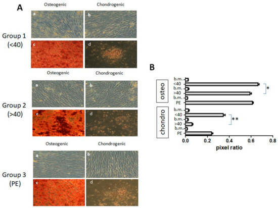 Image analysis determined that hAMSCs from Group 2 were characterized by a lower differentiation capacity towards osteogenic and chrondrogenic lineages in comparison with Group 1, while Group 3 hAMSCs showed a nonsignificant tendency to lower differentiation capacities (Figure 4B).
