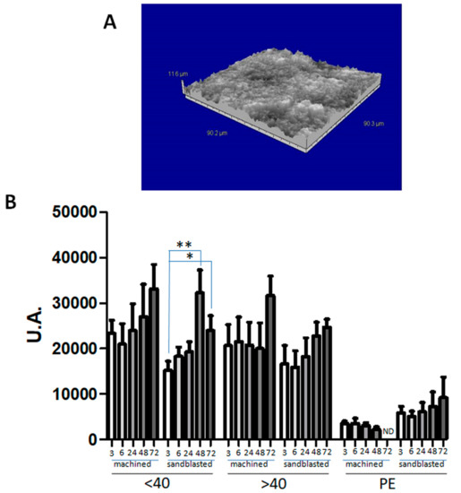 Adhesion of hAMSCs to titanium disks. Panel (A) shows a surface view of the sandblasted disk, obtained by the rugosimeter software. Panel (B) illustrates the results obtained when CM-DiL-labelled cells (p2) obtained from Group 1 (<40), Group 2 (>40), or Group 3 (PE) were seeded on machined (smooth) or sandblasted titanium disks, and associated fluorescence was assessed at 3, 6, 24, 48, and 72 h. ND: not determined. Results are expressed as mean ± SD of three experiments carried out each in triplicate for each isolate. * P < 0.05; ** P < 0.01.