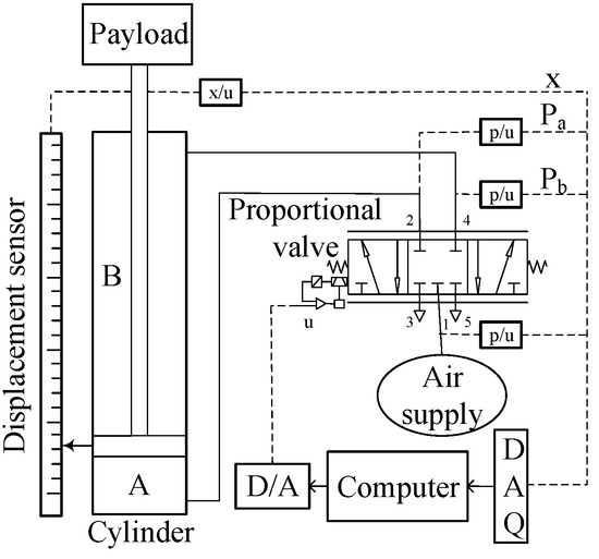 Pneumatic actuators have been widely used in industrial applications due to the advantages of having a high power/mass ratio, being low cost, clean, and easily serviced [1,2,3]. Some examples are pneumatic force actuator systems [1,4], positioning control systems [5], and rehabilitation devices [6]. However, the dynamics of the pneumatic system are complicated, including the nonlinearities of pressure dynamics, the compressibility of air, unmodeled friction, and random disturbances, etc. The unmodeled dynamics, disturbances, and inaccurate mathematic models result in achieving precise motion control of pneumatic cylinders being a challenging task.