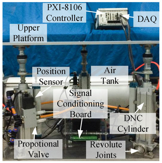 In this paper, various experiments of a single rod pneumatic cylinder system are considered. As shown in Figure 3, the middle branch of 3-RPS platform was considered as the object. The single pneumatic system was with time-varying inertia as it tracks the designed trajectory. A PXI-8106RT controller with a data acquisition card (DAQ) was set up as the control system. A potentiometer and pressure sensors were used to measure the displacement of piston and pressure inside the cylinder. Velocity and acceleration of piston were estimated by a nonlinear tracking differentiator [35]. Experimental setup specifications are listed in Table 1. The sampling frequency of the controller was set to 1 kHz.