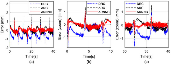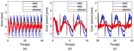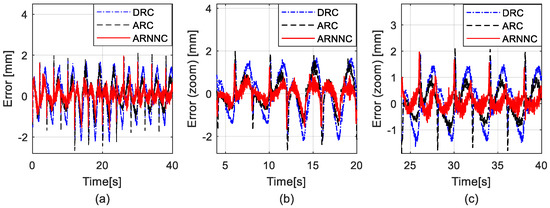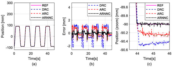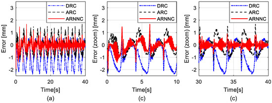 Case study III—Sinusoidal trajectory (load): To further test the performances of the controllers, another series of trajectory tracking experiments of the sinusoidal reference signal with frequency 0.5 Hz and amplitude 90 mm were performed. As shown in Figure 6, Figure 8 and Figure 9, free load, 5 kg load, and 8 kg load conditions were carried out. The of the DRC controller with free load, 5 kg load, and 8 kg load, was 0.8539 mm, 1.2565 mm, and 1.5386 mm, respectively. Compared to the DRC, both the ARC and ARNNC performed much better, and the performance of ARC and ARNNC changed little when the load increased. The of ARC in three different conditions was 0.6291 mm, 0.6429 mm and 0.7242 mm, which were much smaller than the DRC. Nevertheless, the ARNNC achieved the best performance due to its ability to compensate for unmodeled dynamics, the unknown disturbances, and residual errors. of the ARNNC in the three conditions was 0.1901 mm, 0.2325 mm, and 0.2345 mm, which were about of the ARC. And of the ARNNC at 8 kg load condition was only about of the DRC.