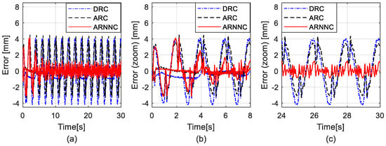 Tracking performances of (a) Tracking errors of different controllers. (b) Zoomed tracking errors from 0 to 8 s. (c) Zoomed tracking errors from 24 to 30 s.