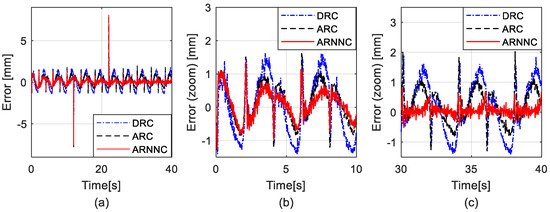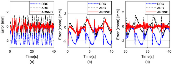 Tracking performances of (a) Tracking errors of different controllers. (b) Zoomed tracking errors from 0 to 10 s. (c) Zoomed tracking errors from 30 to 40 s.