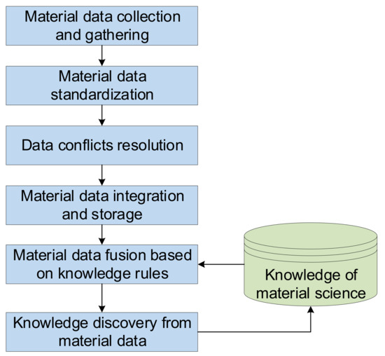The differences between data integration and data fusion are hard to describe. In fact, some researchers acknowledge that these two concepts are almost the same under most circumstances. Nevertheless, data integration is also regarded as the primary phase of data fusion by many researchers. In this paper, we recognize data integration as a procedure of integrating material data sources, data disambiguation, and data storage in a uniform platform. There are some existing integration techniques, and some typical techniques include multi-level data integration, full-vectorization data integration, and knowledge-graph-based data integration. The existing truth-finding techniques used in data integration are analyzed and discussed in the literature [22]. Due to the continuity of material data, certain data ranges and heterogeneity, it is preliminarily judged that CRH (Conflict Resolution on Heterogeneous data) [23] may be a suitable framework for material data. Other researchers proposed to perform material data integration based upon semantic recognition [24,25] and ontology technologies [26], such as lexical semantic similarity calculation, ontology alignment, semantics recognition with models like CRF (Conditional Random Field), and rule-based ontology matching. Data integration with semantic-index-enabled knowledge bases was also proposed in the literature [27]. Material ontology can be indexed semantically with the help of knowledge bases. Knowledge base generation consists of manual work [28] and algorithms like entity matching [29,30] and extracting semantic relations [31,32].