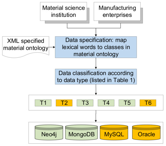 According to the general process of material data fusions shown in Figure 1, we first need to define the various data items for materials. Take the aluminum matrix composite material as an example; when designing the material, it is necessary to design the particle shape, size, orientation and the distribution statistics of the composite material. The material preparation needs to consider the diameter, height and weight of the material. It needs to be accurate to describe the interfacial tensile strength of aluminum matrix composites when describing the material characterization. The material processing stage needs to consider the maximum diameter, thickness and maximum rolling thickness of the forging. The LIMS (Laboratory Information Management System) [11,12] technology can be used for collecting material data automatically, analyzing data and material data management in many fields.