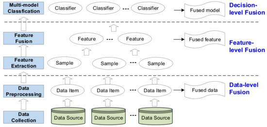 Multi-source data fusion is a process of cognizing, synthesizing and judging a variety of data. The data involved in the fusion process often have properties such as multi-source, heterogeneity and incompleteness. Generally, data fusion methods can be categorized as probability-based methods, evidence reasoning methods and knowledge-based methods [33,34,35], but another point-of-view is to divide data fusion into data-level fusion, feature-level fusion and decision-level fusion [36,37], as shown in Figure 3. The data-level fusion focuses on data collection and preprocessing, through which all data sources are transformed, cleaned and integrated into a fused data store. The feature-level fusion mainly consists of two processes, namely feature extraction and feature fusion. The feature extraction process aims to extract features from original data items or sampled data items. The extracted features are inputted into the feature fusion process to form fused features. For example, physical features can be fused with chemical features to produce fused features for materials. The decision-level fusion is regarded as a multi-model classification, where different classifiers are examined on features as well as data items to get the optimal model for decision making, e.g., predicting the performance of a future material.