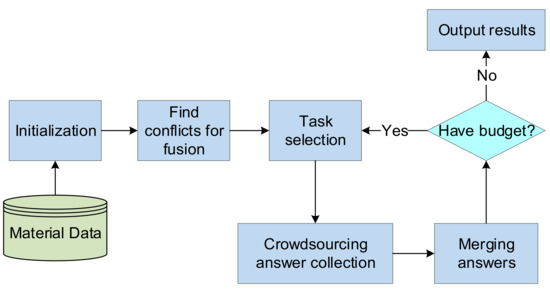 1. Manual methods, e.g., using crowdsourcing to solve conflicts that are easy to be judged by humans [38]. The basic goal of crowdsourcing algorithms is to select a set of tasks to ask crowds, in order to improve the confidence of data under limited budgets, which is an optimization problem. The crowdsourcing fusion system architecture is shown in Figure 4.