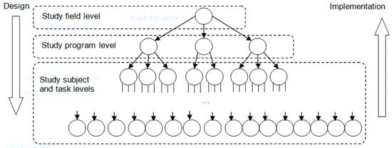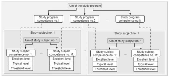 The current higher education system in Lithuania is moving to competency-based evaluation. The study programs must have one objective, see root level in Figure 1, and a list of competencies the study program must transfer to its graduates. These are the study program level competencies, see child elements of the root node in Figure 1. The second level is the study subject, course competencies. Each study subject in the study program must have an aim and a list of study subject competencies, see smaller rectangles in Figure 1. Study subject competencies should be mapped to study program competencies. There must be more than one study subject, which will detail a study program competency. Each study subject competency must also have three achievement levels: Threshold, Typical, and Excellent. Those levels are dedicated to being used as guidelines for students’ evaluation. The abstract scheme of the study program relation to study subject competencies is presented in Figure 1. The similar higher education system is applied in other European countries as well.