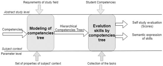 During the last decade, the ideas of student-oriented learning, student competency level estimation, and personalized e-learning gaining speed in Lithuania [1,2,3], as well as worldwide [4,5,6,7], have been proposed. However, the practical application of these ideas is not as smooth. Each study area or even a study subject and course has its specifics. At the same time, the competency level definition and estimation are very context-dependent [8]. This leads to a situation when competencies in different study subjects are not suitably aligned, and the list of competencies in the study program becomes very fragmented. The same problem can be noted in a single study subject too. Study subjects usually have no regulated topic and/or task sequence analysis.