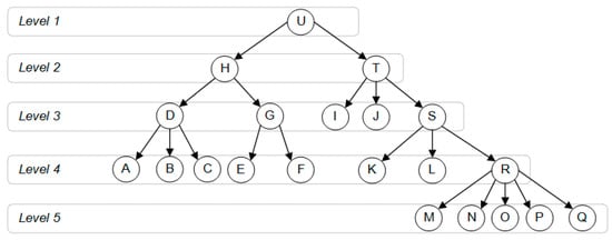 For illustration, we presented a possible course/test competency tree structure, see Figure 4. Nodes in the competency tree are named by letters rather than full descriptions of the competency in this example for simplicity. The score of the top-level (Level 1, node U) will always be 1 (100%) as it shows the student’s capability to show all needed competencies. The course/test root element in the competency tree will be equal to the objective of the course/test while the first level child elements (H and T in Figure 4) will be selected from the study program competency tree. Each selected competency keeps its structure and has the same child nodes as in the original competency tree. However, not all levels can be presented in the course/test competency tree. If competency will not be gained/proved in the course/test, it should not be included in the course/test tree and treated as pre-required competency. Pre-required competencies show the requirements for the student to be able to solve the task or requirements for previous material to understand the new one.