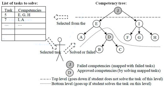 Despite the recommended algorithm for task selection, different strategies can be selected. According to the students’ learning profile, the student can start from top-level tasks, go step by step to the lowest level tasks (recommended for tasks, dedicated to learning, rather than testing student’s skills), or from the middle or selected level of skills. The main idea is to define which competencies the student can demonstrate and which are missing. Therefore, the selection of the next tasks should be done from the range of tasks, which are mapped to competencies from the top to the bottom level, see in Figure 5.