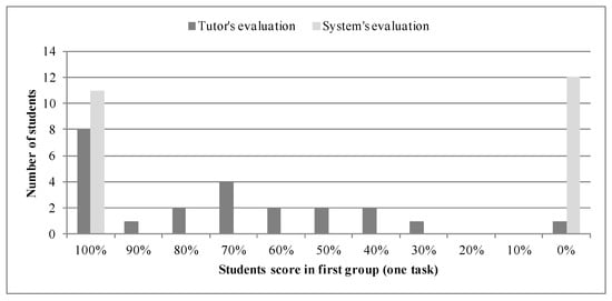A total of 47% of students from the first group managed to solve the task in the e-evaluation system, while 44% of students were able to do it in the second group, see in Figure 7 and Figure 8. However, students from the second group were able to do other tasks, and 10 students of 14 were able to solve an easier task without solving the main (overall) task. The results revealed that the usage of bigger task bank was useful to get more distributed scores in comparison to “all or nothing“ situation with one task. The tutor inspected all submitted works and evaluated them without knowing the score, calculated by the system. Tutor’s scores are presented in Figure 7 and Figure 8 for 1st and 2nd group of students, respectively.