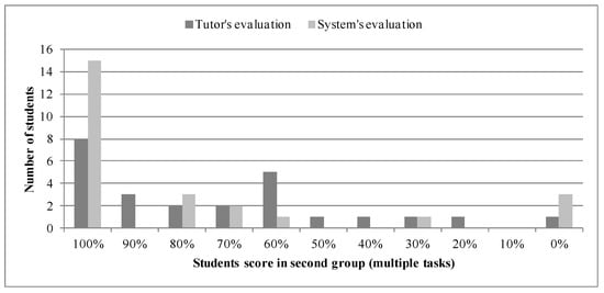 The average difference between system and tutor score for each student in group 1 was 24%, while in group 2–6%, respectively. The standard variation of the difference between system and tutor score for groups 1 and 2 was 35% and 15%, respectively. This shows that the proposed e-evaluation method with multiple tasks can calculate the students’ knowledge score, similar to tutors evaluation. The results possibly could be improved by adding more assignments in the task. A big variety of tasks gives additional flexibility and adaptability for the e-learning and e-evaluation. Each student has his learning and competency history; therefore, each student might need a different path for his new competencies approval.