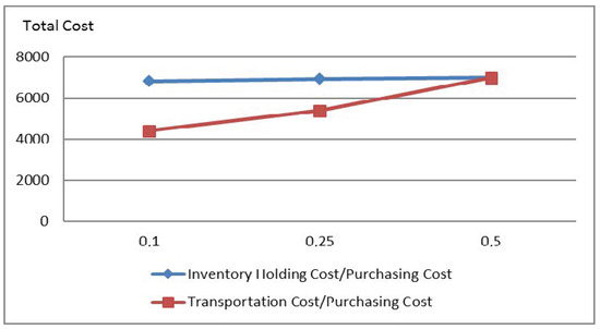 The data are the same as the previous scenario. The effect of the proportional change on total cost is observed by changing the ratio of unit transportation cost per unit distance to the undiscounted price per unit of component at 50%, 25%, and 10% rates. Figure 1 illustrates the effects of changing the ratios of transportation cost and inventory holding cost over purchasing cost.