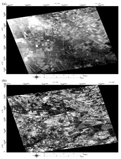 In the literature, various methods and techniques have been proposed for satellite image registration [,,,,]. In general, the registration methods can be divided into two main groups: area-based and feature-based methods. Area-based methods compare the pixel intensities of the overlapping regions in images by using a similarity measure such as square sum of difference (SSD), mutual information (MI) and/or normalized cross-correlation (NCC) [,]. In these methods, similarity measure plays an important role and the accuracy of the method depends on the selection of an appropriate similarity measure. Usually, these methods provide well-distributed control points; however, these methods suffer from high computational time due to huge numbers of multiplications and divisions. On the other hand, feature-based methods are based on features (points, lines, intersections, etc.) instead of pixel intensities, from the corresponding regions of one or more images []. The accuracy of feature-based methods mainly depends on two factors: detected numbers of key-points and the distribution of these key-points over the image. Particularly, a well-distributed set of key-points provide higher accuracy as compared to a set of too clustered points [,]. These method are fast; however, their accuracy depends on the correct matches of features.