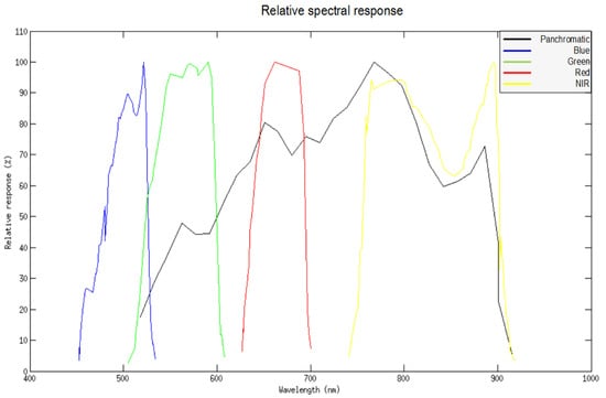 Relative spectral response: panchromatic images (0.50–0.90 ), blue band (0.45–0.52 ), green band (0.52–0.60 ), red band (0.63–0.69 ), and NIR band (0.76–0.90 ).