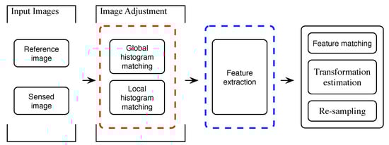 Flow chart of the proposed registration steps: the red box indicates image adjustment, while the blue box indicates feature extraction.