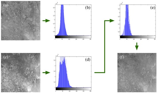 Global histogram matching: (a) reference image; (b) histogram of (a); (c) sensed image; (d) histogram of (c); (e) global histogram matching; and (f) histogram matched image.