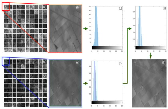 Algorithm 1 shows the flow of local histogram matching. The procedure is same as done in the case of global histogram matching; however, here, histograms of blocks (Figure 5a,d: the block-wise reference and sensed image) are matched instead of histograms of entire images (Figure 4a,c).