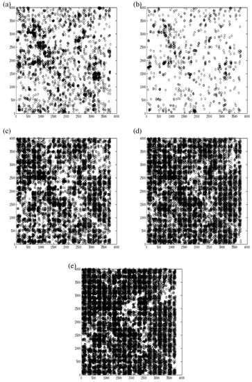 Control points distribution images of Sample 3 using: (a) SIFT; (b) SURF; (c) SSD; (d) NCC; and (e) FZNCC.