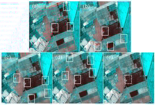Samples of pseudo RGB images of Dataset 3: (a) SIFT; (b) SURF; (c) SSD; (d) NCC; and (e) FZNCC. The white box indicates inaccurately registered area.