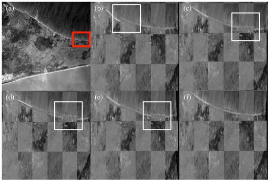 Figure 9 shows the resultant images obtained through the feature-based methods (SIFT in Figure 9a and SURF in Figure 9b) and area-based methods (SSD in Figure 9c, NCC in Figure 9d and FZNCC in Figure 9e) for Dataset 3. The figure is composed of pseudo color: red, sensed image; green, reference image; and blue, reference image. If the sensed image is not registered accurately, the red color appears. The white boxes represent the local registration error. In the figure, it can be observed that the registration errors (red colored areas) are visible in the resultant images obtained from the conventional methods SIFT, SURF, SSD and NCC, whereas the proposed method can be clearly distinguished visually, and provided better RGB images compared to the conventional methods. Similarly, Figure 10 shows the resultant images obtained through the feature-based methods (SIFT in Figure 10a and SURF in Figure 10b) and area-based methods (SSD in Figure 10c, NCC in Figure 10d and FZNCC in Figure 10e) for the checkerboard images using Dataset 4. Due to the large image size of satellite images, we show a portion of the area (Figure 10a red box) for better comparison. It can be observed in Figure 10b,e that the conventional methods provided disconnected results, whereas the proposed method provided accurate registration results. It shows the superiority of the proposed method over the conventional methods in terms of registration accuracy.