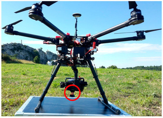 The position of the device in space has been measured with the RTS Leica Nova MS50. The polar coordinate measurement system determines the XYZ-position of a moving 360° mini prism with respect to a certain time stamp while using the three-dimensional (3D)-distance as well as the horizontal and vertical angles. The RTS is equipped with servomotors and a moving prism tracking system. According to the data that were provided by the manufacturer, the MS50 operating in a continuous measurement mode allows for the position of a moving object to be recorded at a frequency of up to 20 Hz. The MS50 determines the vertical and horizontal directions with accuracy of 1″ and it makes distance measurements with accuracy of 2 mm + 1.5 ppm in tracking prism mode [58]. During the tests, an average data recording frequency of 5.8 Hz has been achieved. The tracked prism has been mounted on the camera stabilisation controller (gimbal), Figure 3. It allowed for determining the changes in the position of the camera that is the most important from the point of view of the quality of the photogrammetric data being captured.