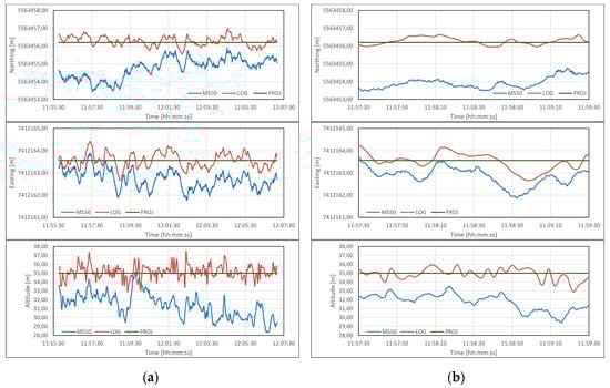 As a result of the field studies, the coordinates of the points measured while using the Leica Nova MS50 have been captured, in the geodetic coordinate system 2000. The data have represented the actual position of the UAV in space. This data set has been hereinafter denoted as MS50 and should be considered as reference. Moreover, the data presenting the coordinates and altitudes recorded by the drone, stored in the LOG files saved in the on-board computer, have been acquired. These data have been recorded in the WGS84 system (EPSG 4326) and they have been transformed to the 2000 system, in the calculations and in the diagrams that they have been marked as LOG. The last type of the data that has been subject to a later analysis are the ones dealing with the coordinates of the points designed to be implemented by the UAV. The mission projects have used the coordinates in the WGS84 system, which have also been converted into the 2000 system. In the calculations and on the diagrams, they have been marked as PROJ. The altitudes have been designed while assuming that the UAV take-off point has had the altitude 0 m. Thus, the comparison of the altitudes has required the reduction in the data captured from the surveying instrument at the beginning of each mission. Correlating the UAV’s take-off and landing time have carried out the time synchronisation of the data that were captured from the RTS and the UAV. Samples selection for further analysis was based on finding the MS50 and LOG samples, which was characterized by the smallest time differences between the moments of their record. In the measurement results from MS50, the prism position has been reduced relative to the GNSS antenna that was installed in the UAV, while taking into account the measured offset and the data recorded by the IMU, mounted in the drone, and stored in the LOG files from each flight. Therefore, it has been possible to cross-compare these three sets of data, and the following data sets have been created in the form of the time series, demonstrating: