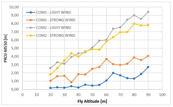 In task 3, the results of all the tests have demonstrated increasing differences between the programmed altitude and the one measured by the MS50 instrument. For COM-1, the differences reach 2.7 m in light wind and over 4 m in strong wind, while for COM-2 they reach up to 9.5 m in light wind and almost 8 m in strong wind. At the same time, the differences between the values that are recorded by the UAV in the LOG files and the design values at the same points have not exceeded 1.00 m, with an average of 0.15 m Table 6. The numerical values corresponding to the differences between the data that were captured from the MS50 and from the LOG files of the UAV are similar to the data discussed as task 1. The results of this task prove the occurrence of the error of the barometer scale, which has affected the flying altitude reached relative to the take-off point. The observed errors of barometric sensors may negatively affect flights at low altitudes [33,37,66], for example, in application [31], the flight altitude is 18m above the top lightning line (the top line). Altitude changes that are greater than 5 m can be a serious threat to the UAV during power line inspection. Precise flight altitude planning is also important for the implementation of the smart city concept [6] and the phenomenon of lowering the flying altitude may adversely affect the assumed parameters of image overlaps when conducting photogrammetric missions [12,51,52,67]. Table 6 additionally presents the parameter denoted as scale, the value of which has been calculated as the ratio of the reached altitude measured by MS50 to the design altitude. It should be noted that, for the COM-1, its mean value has ranged from 0.98 in light wind to 0.95 in strong wind, and for the COM-2 from 0.89 in light wind to 0.90 in strong wind. As can be seen from these parameters, the barometric sensor in COM-1 has shown its susceptibility to wind influence. The high values of the altitude correlations with the PROJ-MS50 and MS50-LOG data indicate the faulty operation of the barometer, Table 7. The low values of the altitude correlations with the PROJ-LOG data suggest that they should be treated as random values. This analysis proves the existence of a scale error in the barometers. The comparison of the mean values of altitude increments between the subsequent mission waypoints in Table 8 also demonstrates that the programmed value has not been reached for the measurement using the MS50 surveying instrument. In the case of the data captured from the on-board computers, the average values coincide with the predetermined values with an accuracy of 0.05 m.